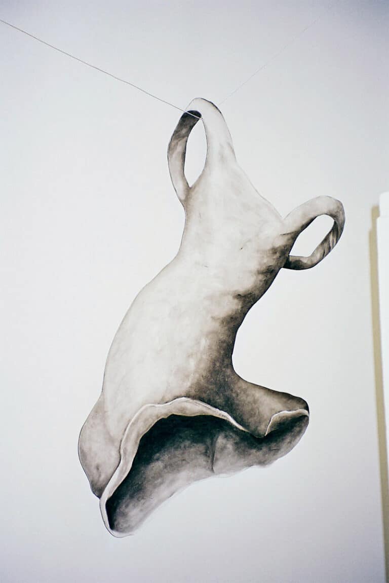 Aan een lijn hangen getekende kledingstukken. De trap voert naar een textiel werkplaats op de tweede verdieping.