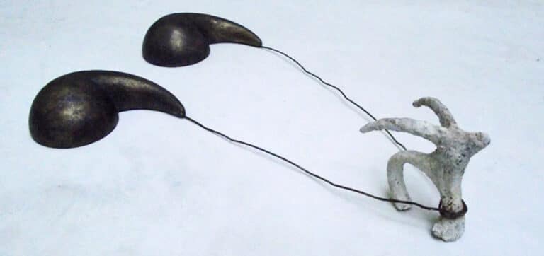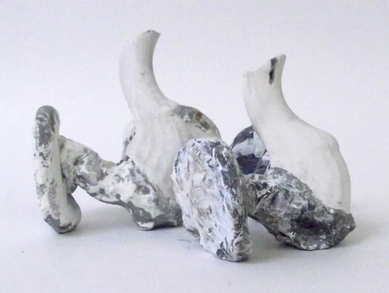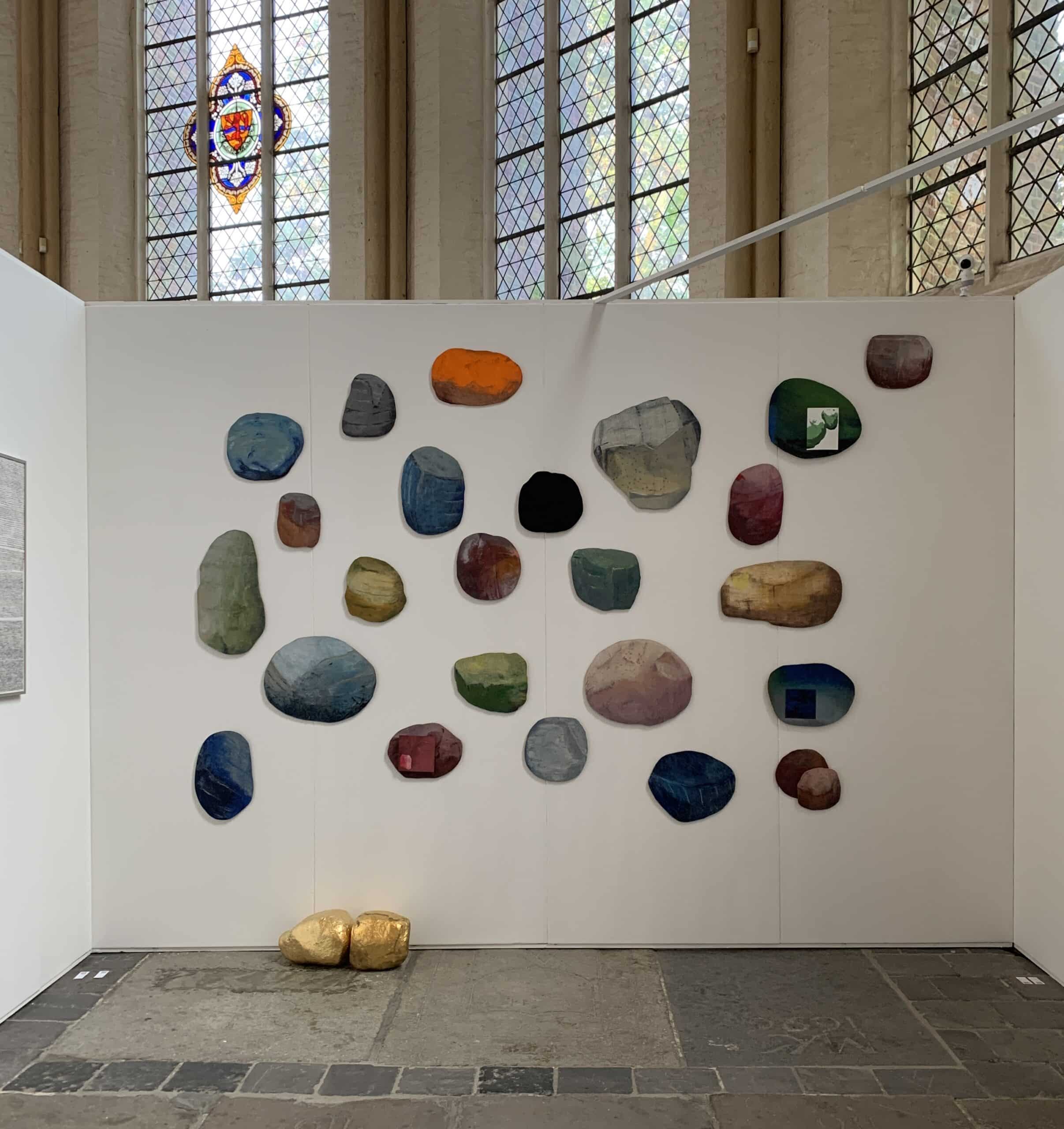 De woorden/begrippen ‘juwelen’ en ‘spelen’ zijn afgeleid van hetzelfde Latijnse woord: jocalis. ‘ Mijn juwelen’ zijn verbonden met mijn roots in Drente, waar ik geboren en opgegroeid ben tussen de hunebedden, de alleroudste bouwwerken van Nederland. De Drentse zandgronden liggen vol losse zwerfkeien, groot en klein, die telkens nog uit de grond naar boven komen. Ze worden gebruikt voor muurtjes, als markering, verzwaring of ornament. Stenen appelleren aan oertijd, aan onverzettelijkheid en tegelijkertijd zwervend vermogen. Sinds jaar en dag teken en maak ik zwerfstenen vanuit herinnering en verlangen; ik laad ze met betekenis, speel ermee, relativeer dat. Sinds Coronatijd en de behoefte aan kleur zijn de stenen kleurrijker, ontleend aan landschappen die ik heb gezien. Ik teken de stenen solitair, in compositie of verhalend.