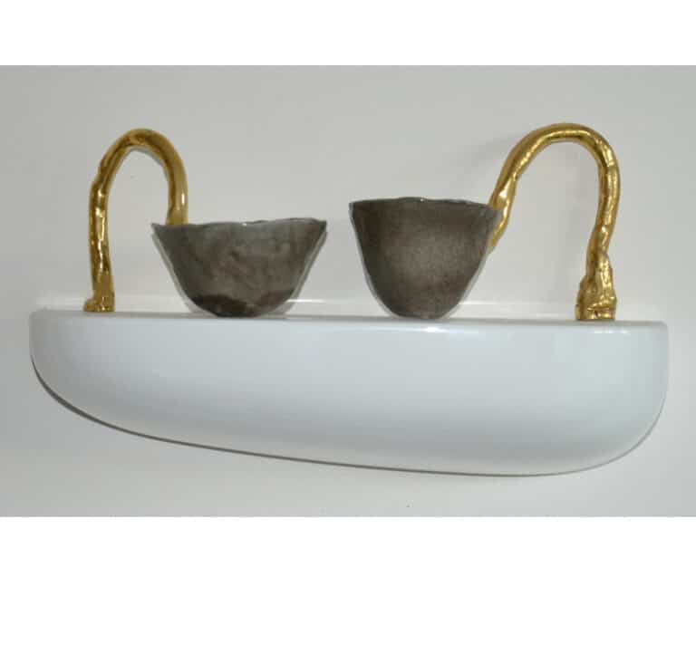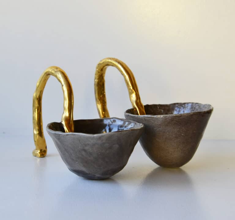 porseleinen kopjes in beperkte oplage , per stuk unica. porselein, galzuur en goudluster. in particuliere collecties.