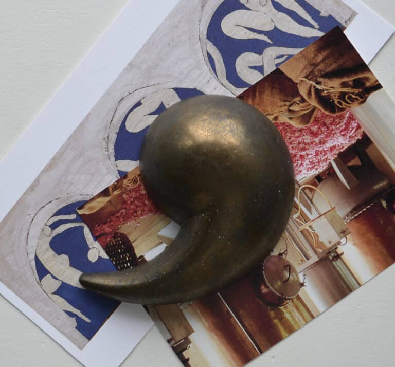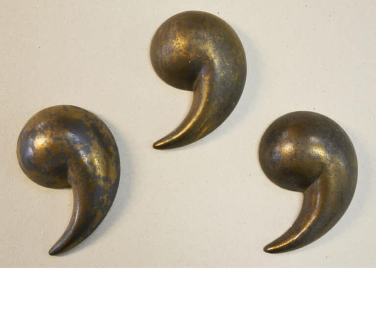 Dit is een presse-papier in de vorm van een komma, van keramiek met bronsglazuur, oplage 50. Deze beperkte oplage is gestempeld met het logo van Buro balans.