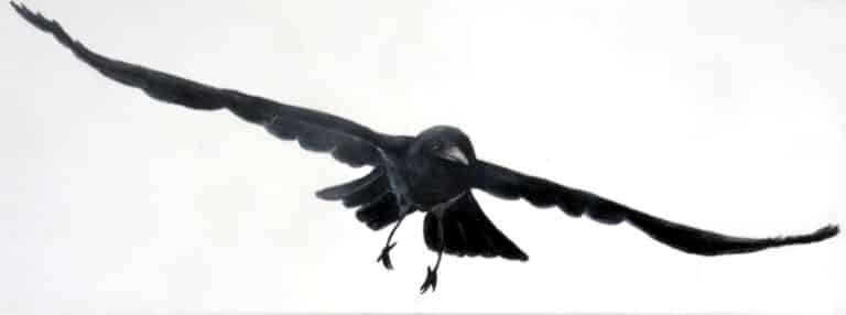 Associatief uitgangspunt voor deze installatie, in Filmhuis de Keizer, is de film ‘the Birds’ (1963) van Alfred Hitchcock geweest. Het was ver voor Jaws en andere films uit het genre ‘de natuur wreekt de mens’. Kraaien kunnen angst inboezemen. Waarom? Doordat ze zwart en groot zijn, krijsen, altijd in de nabijheid en aards zijn? Of door hun intelligentie , de scherpe observerende blik? Wat weten wij van hen en wat weten zij van ons?