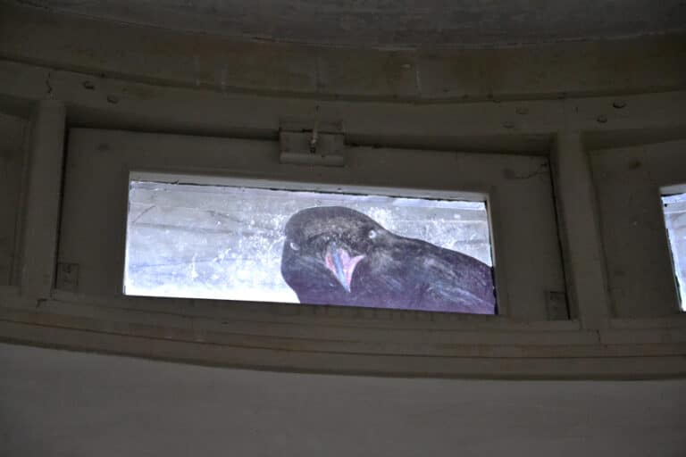 ‘Spied place’: getekende kraaien, geprint op raamfolie, op bovenraampjes. ‘ Spied’ refereert aan het verlangen van omwonenden altijd al te hebben willen weten wat hier binnen gebeurde. ‘ Spied’, ook omdat de natuur de overhand gaat krijgen over dit gebouw. Kraaien verkennen alvast de mogelijkheden.