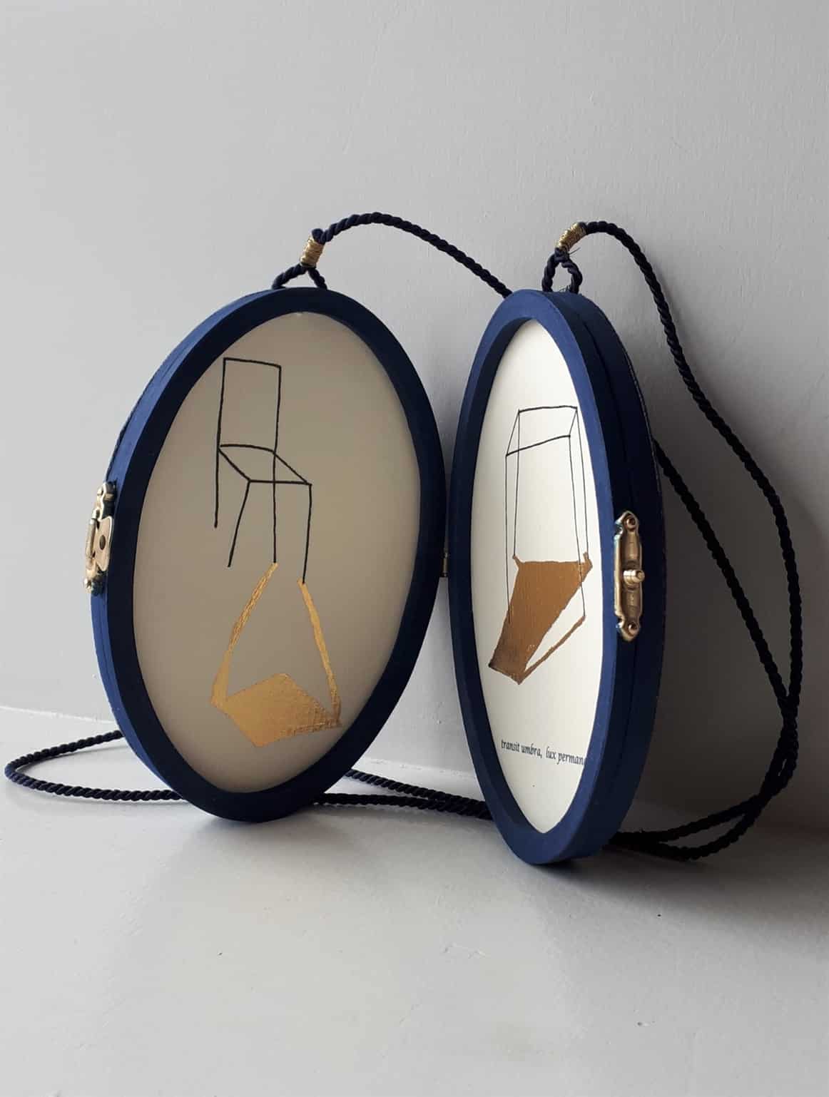 Twee tekeningen met inkt, 23,7 karaats bladgoud en tekst in houten medaillon: oplage 3
